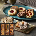 ブルーベリージャムをトッピングした甘酸っぱいロシアケーキやアーモンドをトッピングしたロシアケーキ、食感にアクセントをつけた、程よい甘さのプレーンワッフル、やわらかな生地に、カリカリとした食感がアクセントのチョコレート風味のチョコワッフル、パイ、クッキーなどを詰め合わせたこだわりのギフトです。