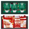 スターバックスコーヒーギフトと、お菓子のセットでワンランクアップのひとときを。大切な方へ、逸品をお届けしませんか? ■ハウスブレンド ナッツとココアのニュアンスにローストのかすかな甘み、そこに酸味とコクが見事に調和した風味が特徴です。創業当初よりお届けしてきた人気のブレンドです。 ■カフェベロナ ダークココアのような口あたり、ロースト感のある深みや甘みと、しっかりとしたコクの奥行きのある豊かなブレンド。 ■ライトノートブレンド ソフトなコクと煎ったナッツのニュアンスが感じられる、やわらかで穏やかな味わい